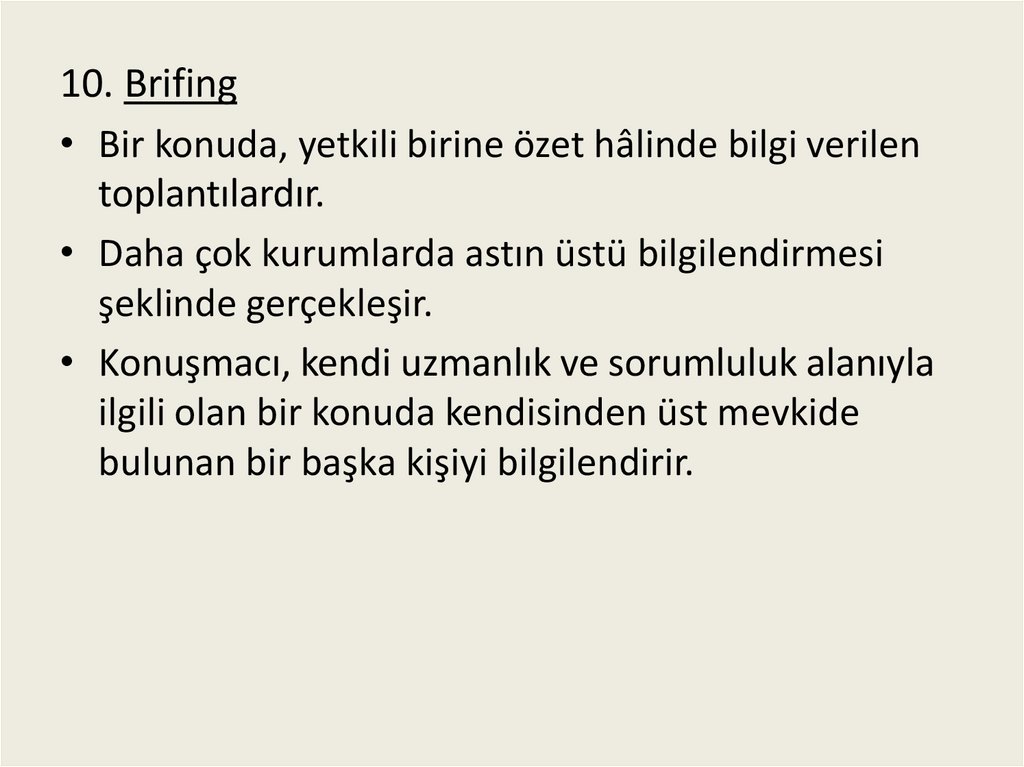10. Brifing• Bir konuda, yetkili birine özet hâlinde bilgi verilen