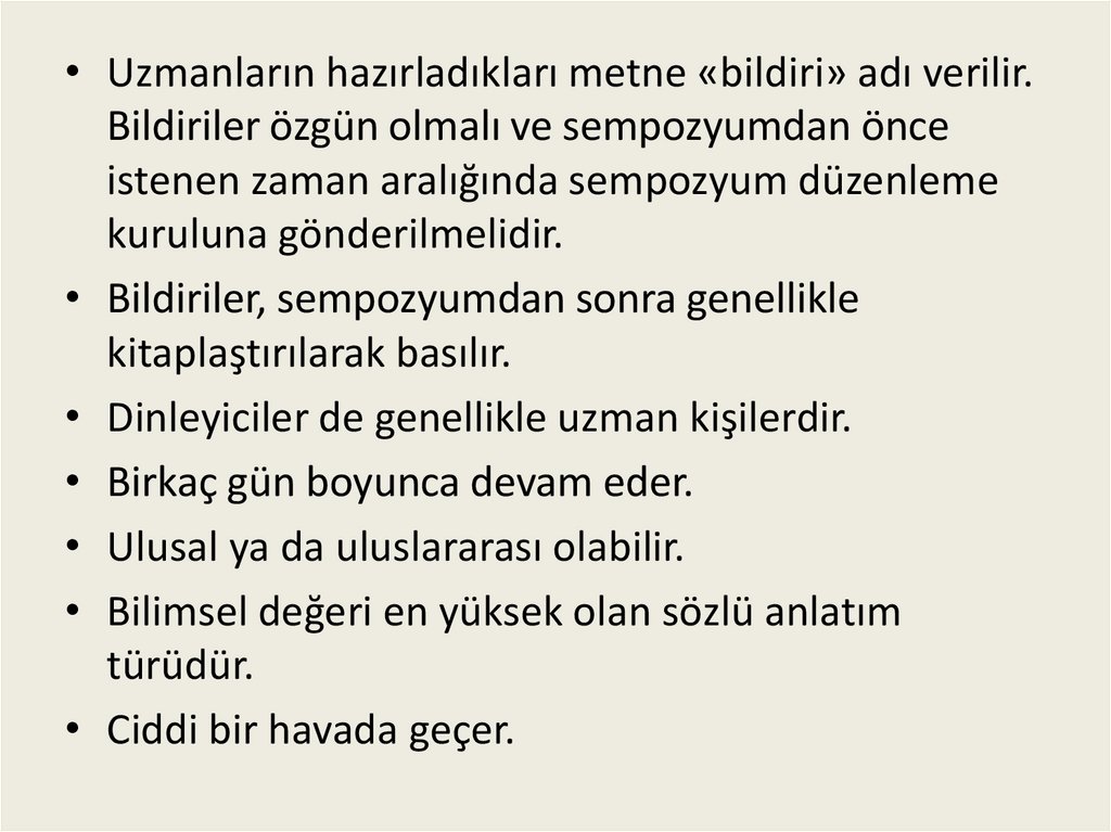 • Uzmanların hazırladıkları metne «bildiri» adı verilir.Bildiriler özgün olmalı ve sempozyumdan önce