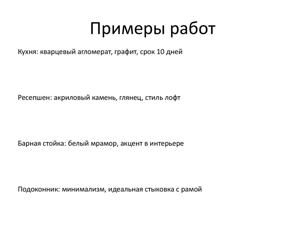 Примеры работКухня: кварцевый агломерат, графит, срок 10 дней