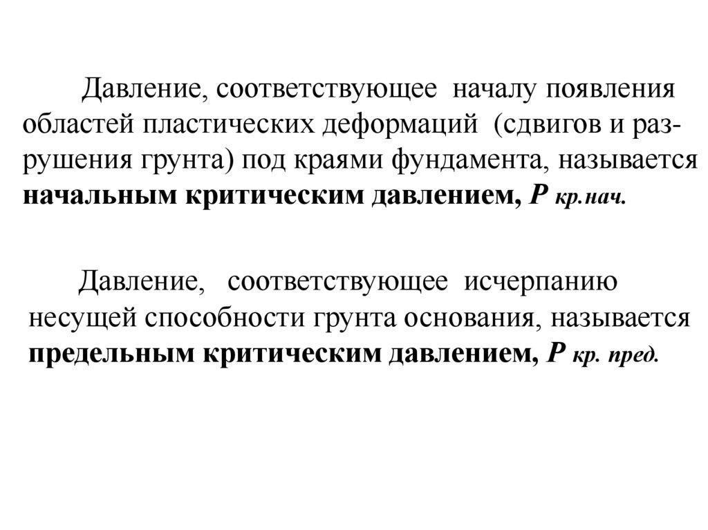 Давление, соответствующее началу появленияобластей пластических деформаций (сдвигов и разрушения грунта) под краями фундамента, называется