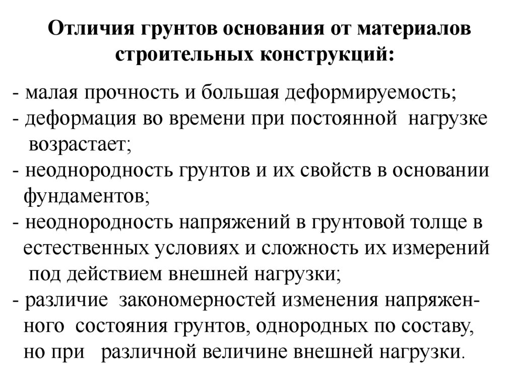 - различие закономерностей изменения напряженного состояния грунтов, однородных по составу,