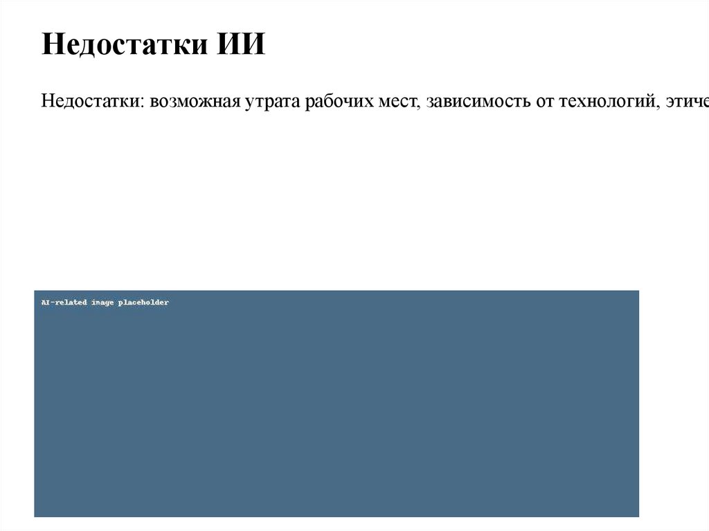 Недостатки ИИНедостатки: возможная утрата рабочих мест, зависимость от технологий, этиче