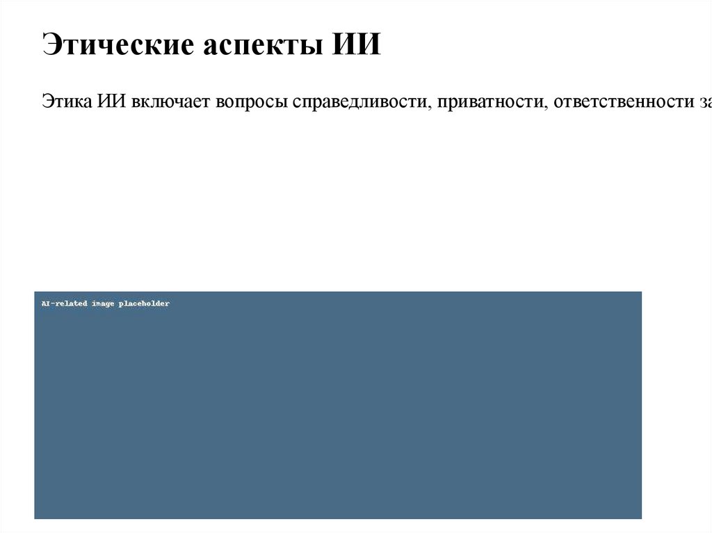 Этические аспекты ИИЭтика ИИ включает вопросы справедливости, приватности, ответственности за