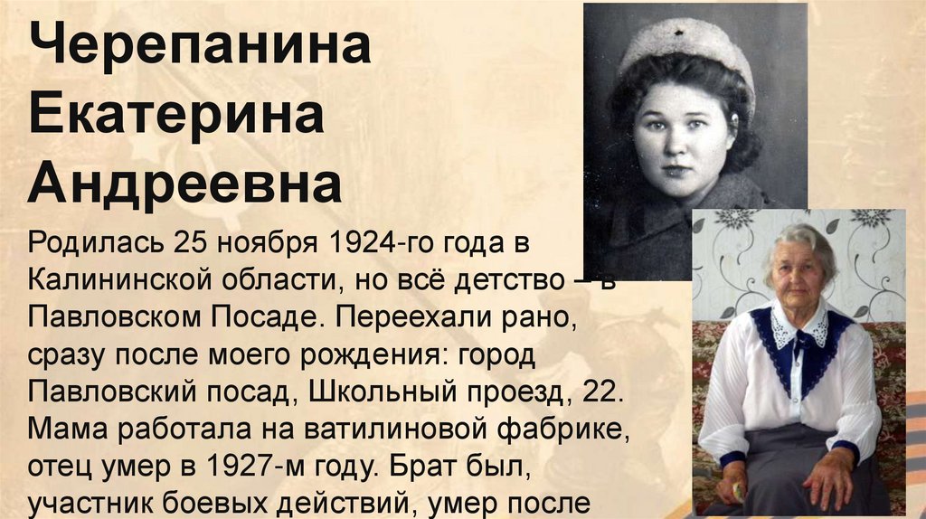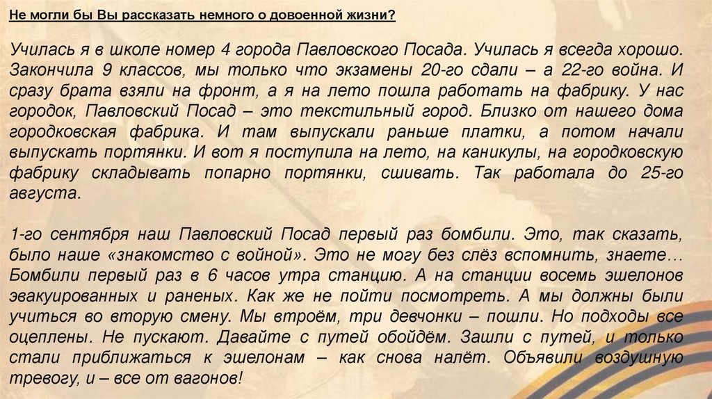 Не могли бы Вы рассказать немного о довоенной жизни?Училась я в школе номер 4 города Павловского Посада. Училась я всегда хорошо.