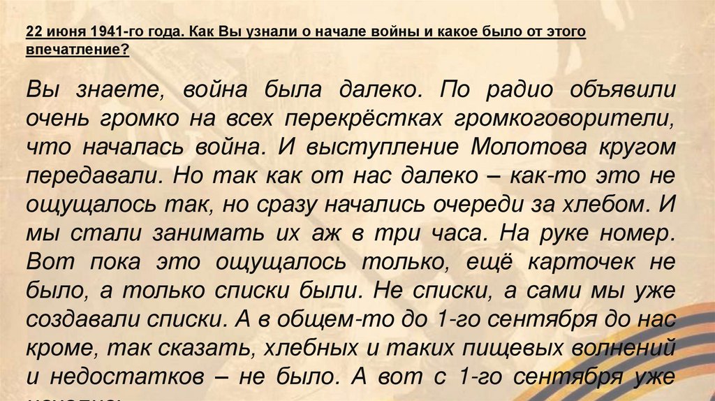 22 июня 1941-го года. Как Вы узнали о начале войны и какое было от этоговпечатление?