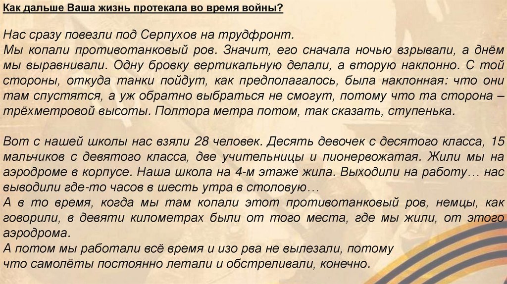 Как дальше Ваша жизнь протекала во время войны?Нас сразу повезли под Серпухов на трудфронт.