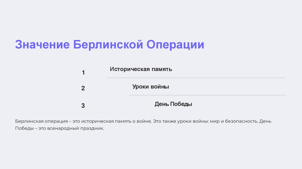 Берлинская операция – это историческая память о войне. Это также уроки войны: мир и безопасность. День