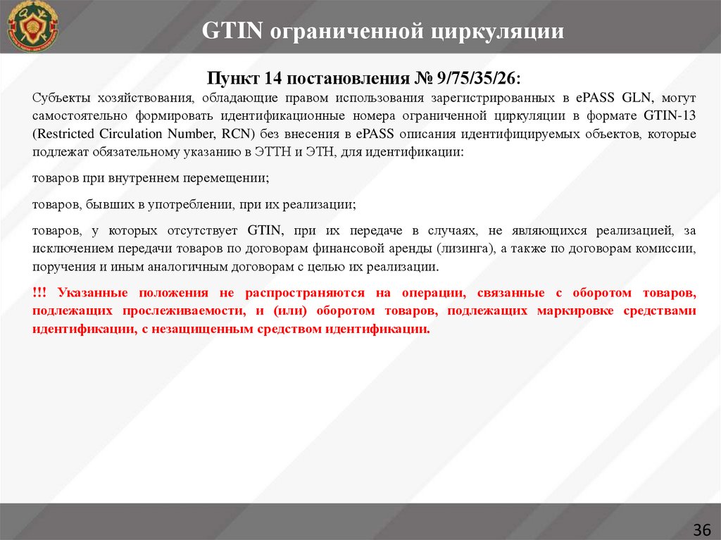 • GTIN (по товарам, подлежащим товарной нумерации и штриховому кодированию)