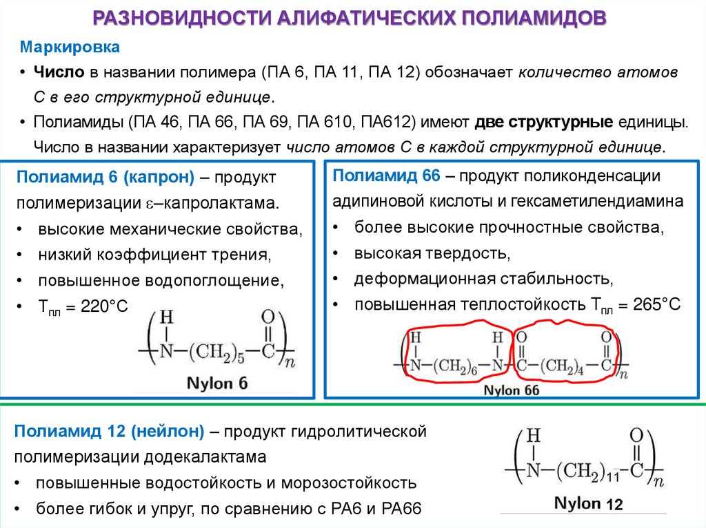 • Полиамиды (ПА 46, ПА 66, ПА 69, ПА 610, ПА612) имеют две структурные единицы.