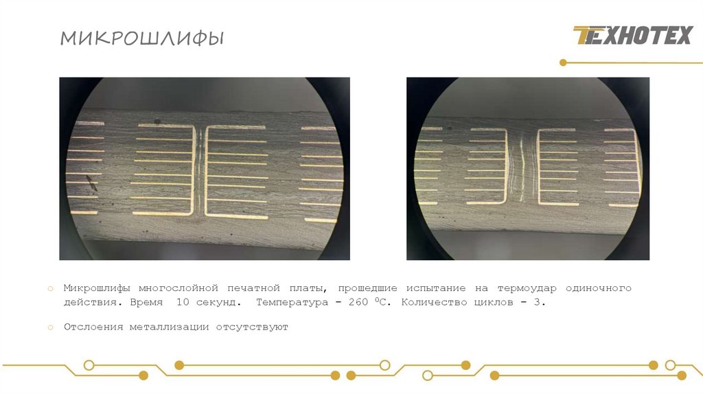 МИКРОШЛИФЫo Микрошлифы многослойной печатной платы, прошедшие испытание на термоудар одиночного