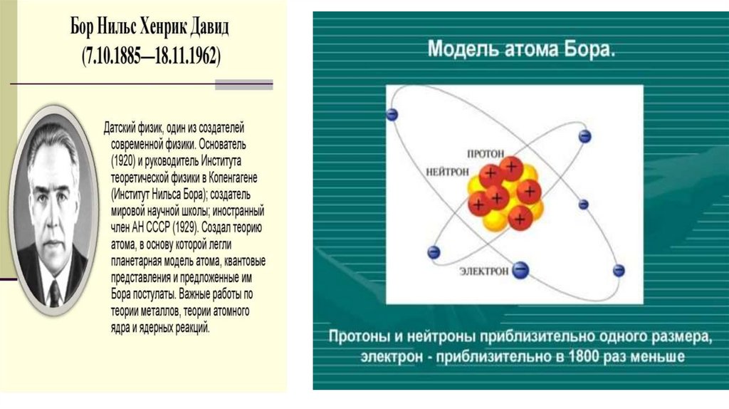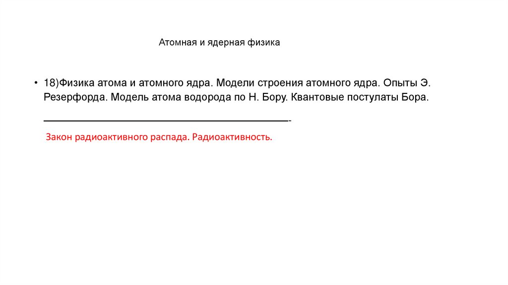 • 18)Физика атома и атомного ядра. Модели строения атомного ядра. Опыты Э.Резерфорда. Модель атома водорода по Н. Бору. Квантовые постулаты Бора.