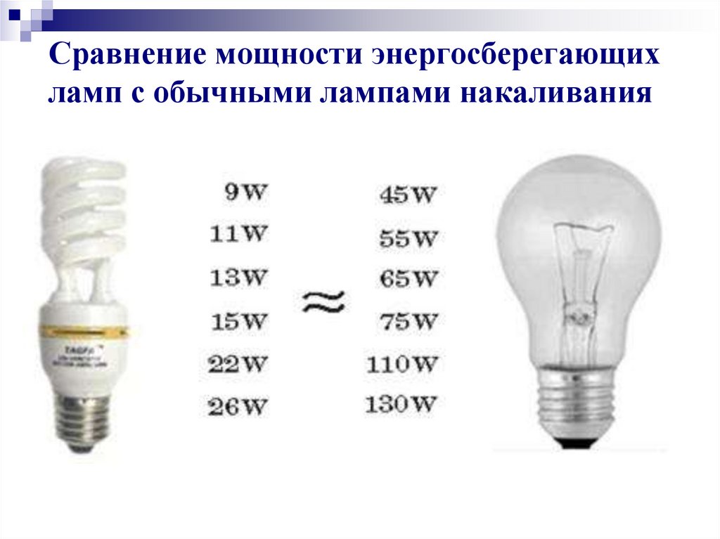 11. Сравнение мощности энергосберегающих ламп с обычными лампами накаливания
