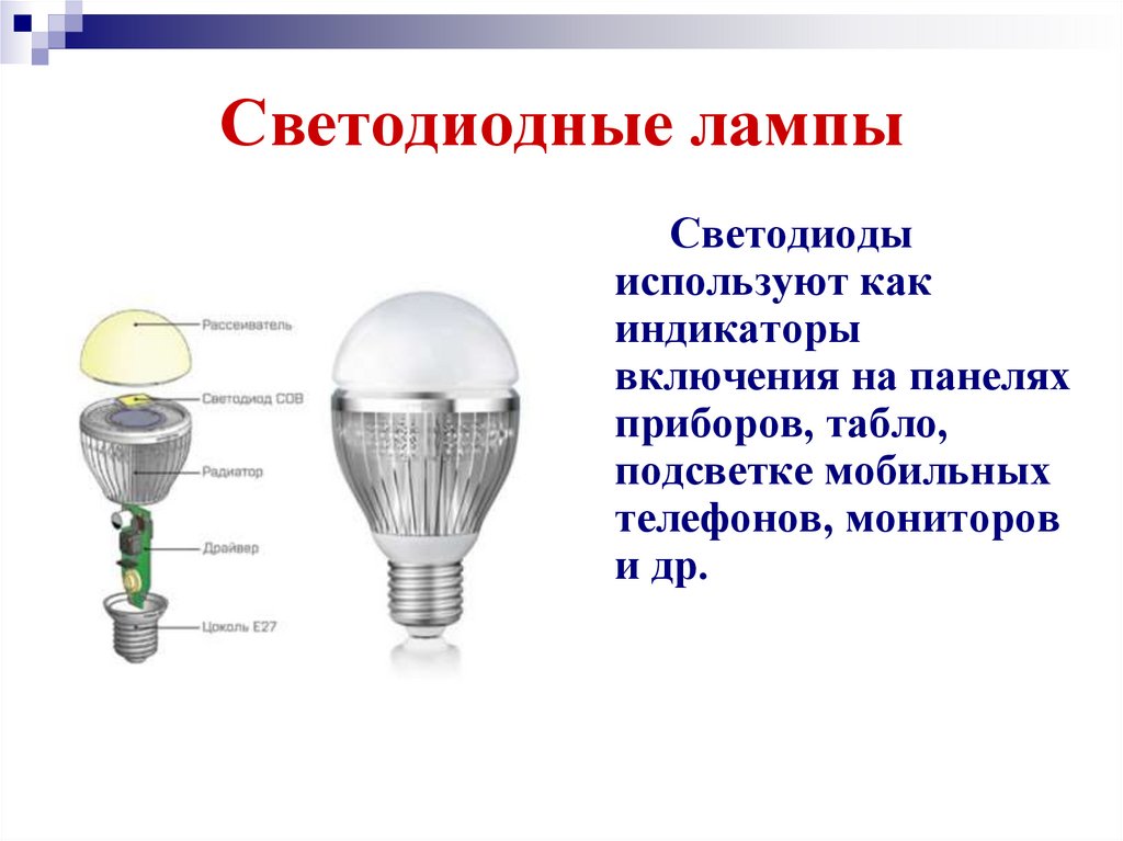 Светодиодные лампы начали использовать с 1962 года.В светодиодных лампах электрический ток пропускают