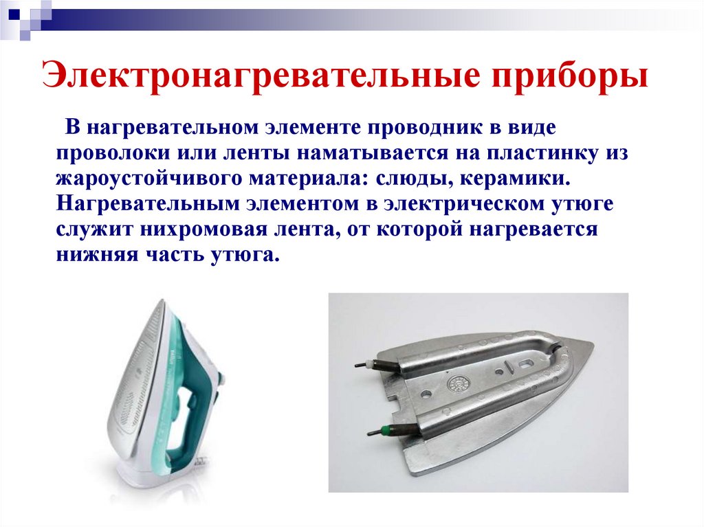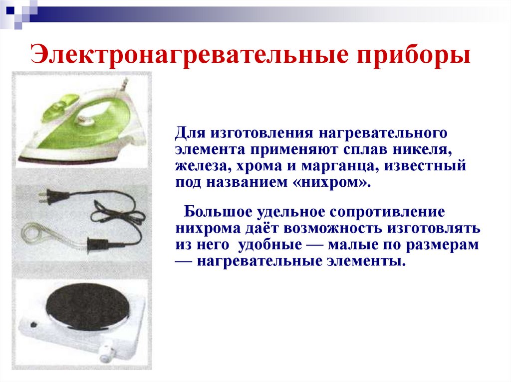 Основная часть всякого нагревательного электрического прибора —нагревательный элемент - проводник с большим удельным