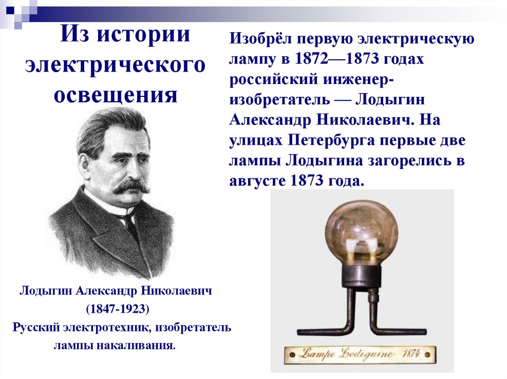 Изобрёл первую электрическуюлампу в 1872—1873 годах