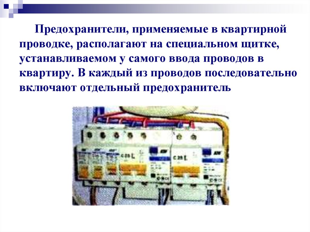 Предохранители, применяемые в квартирнойпроводке, располагают на специальном щитке,