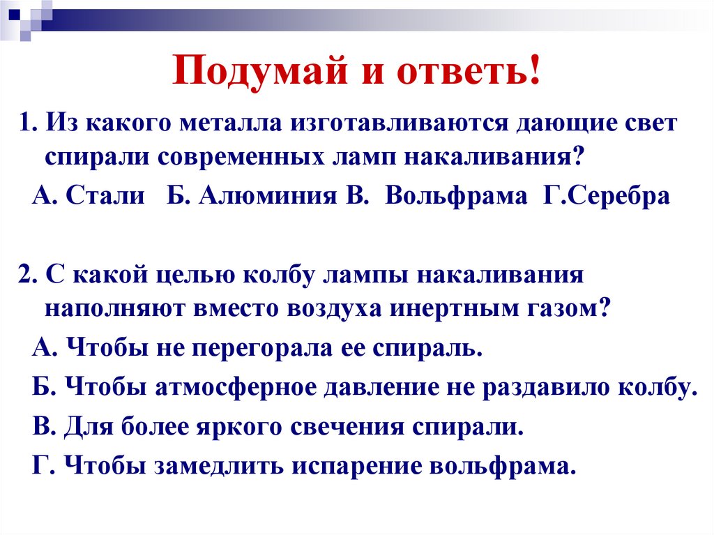 1. Из какого металла изготавливаются дающие светспирали современных ламп накаливания?