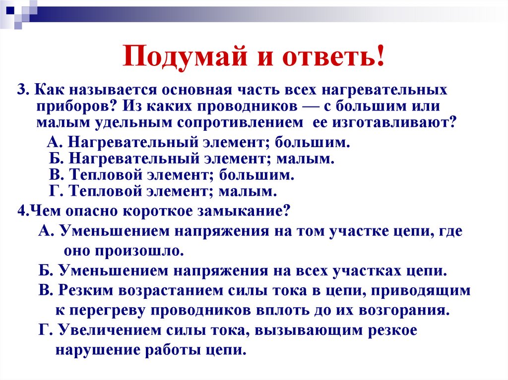 3. Как называется основная часть всех нагревательныхприборов? Из каких проводников — с большим или
