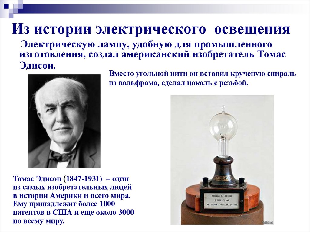 Электрическую лампу, удобную для промышленногоизготовления, создал американский изобретатель Томас