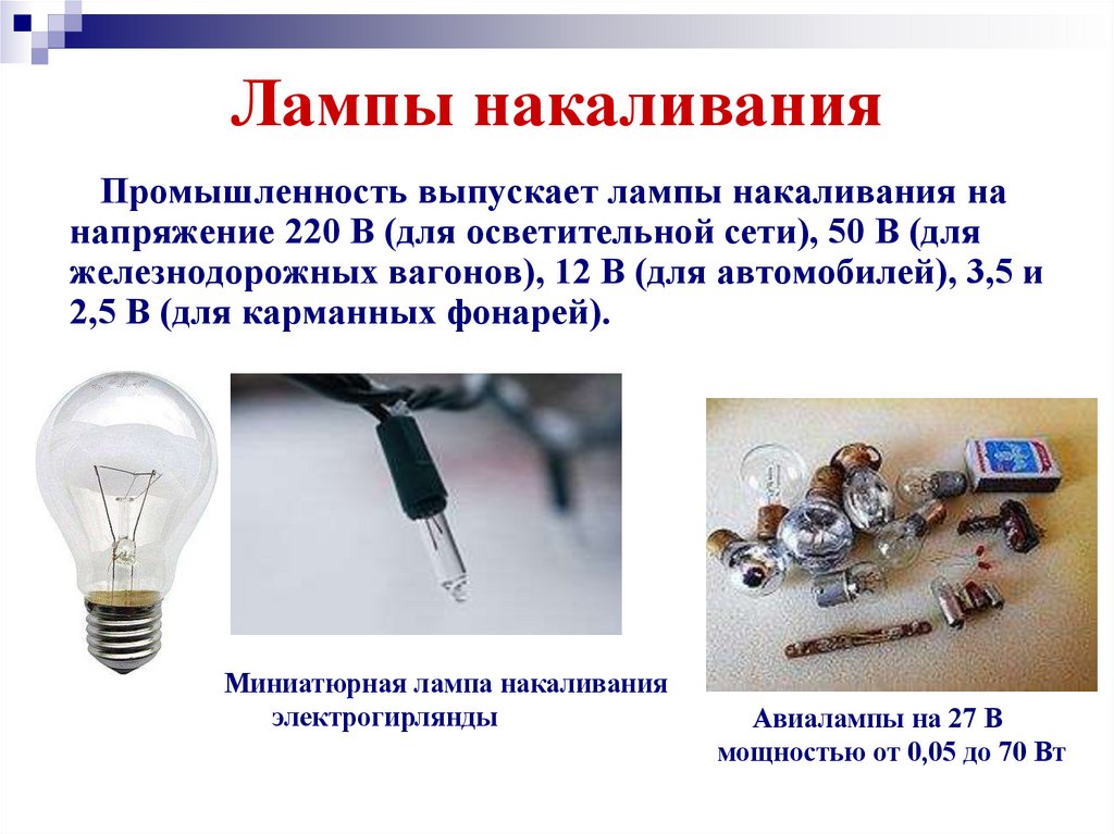 Промышленность выпускает лампы накаливания нанапряжение 220 В (для осветительной сети), 50 В (для
