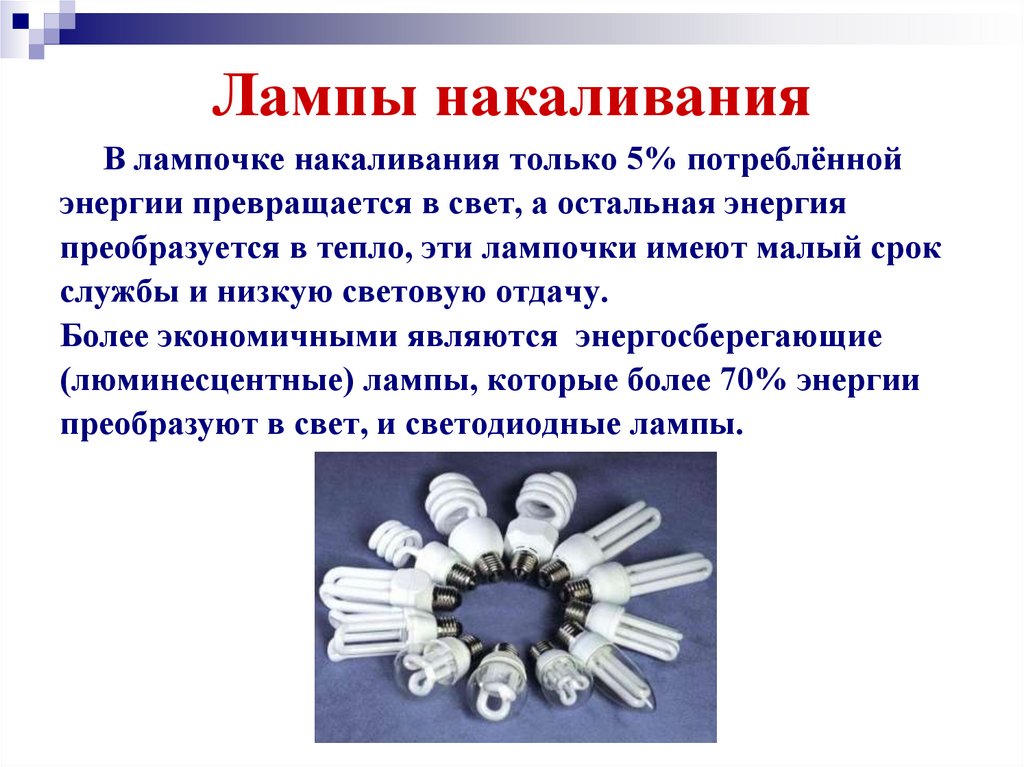 В лампочке накаливания только 5% потреблённойэнергии превращается в свет, а остальная энергия