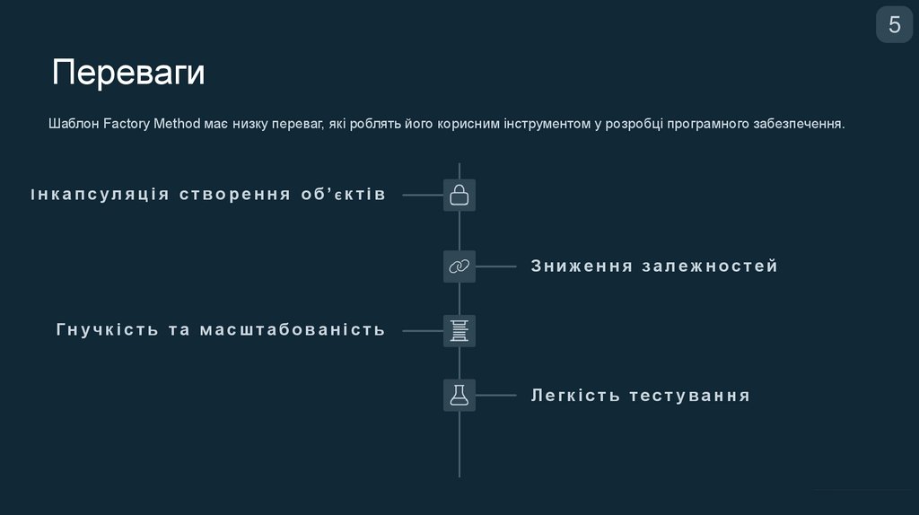 Шаблон Factory Method має низку переваг, які роблять його корисним інструментом у розробці програмного забезпечення.