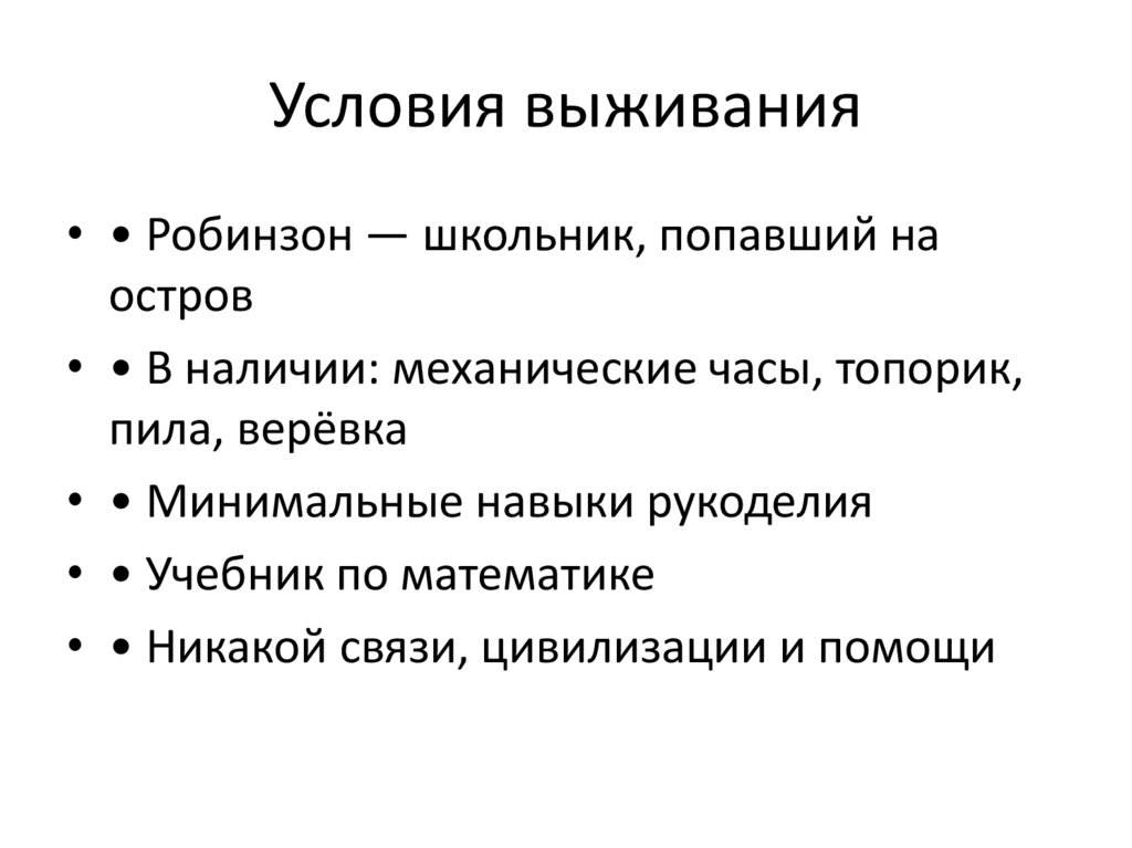 Условия выживания• • Робинзон — школьник, попавший на