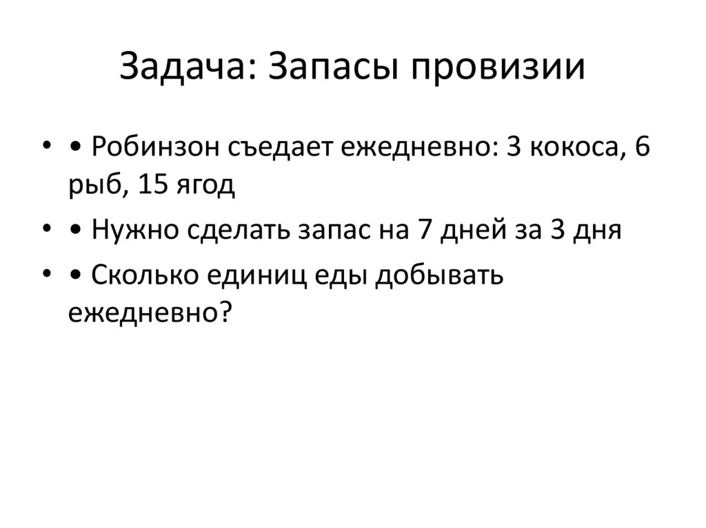Задача: Запасы провизии• • Робинзон съедает ежедневно: 3 кокоса, 6
