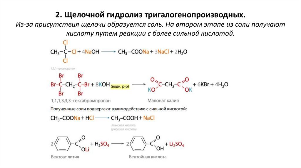 2. Щелочной гидролиз тригалогенопроизводных.Из-за присутствия щелочи образуется соль. На втором этапе из соли получают