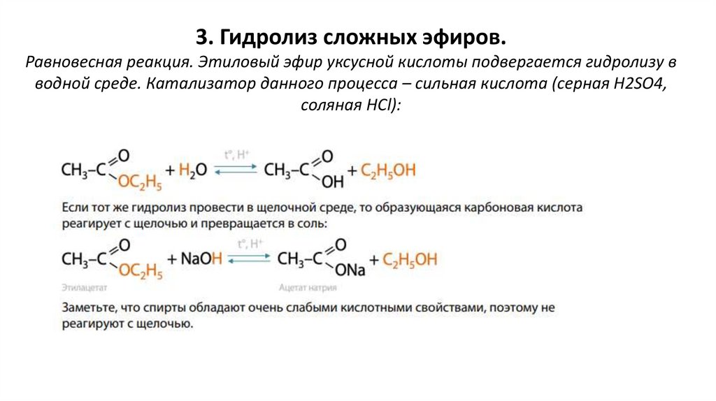 3. Гидролиз сложных эфиров.Равновесная реакция. Этиловый эфир уксусной кислоты подвергается гидролизу в
