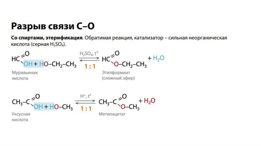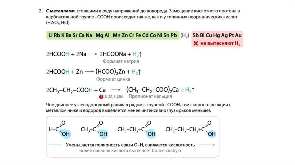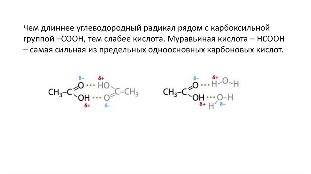 Чем длиннее углеводородный радикал рядом с карбоксильнойгруппой –СООН, тем слабее кислота. Муравьиная кислота – HCOOH