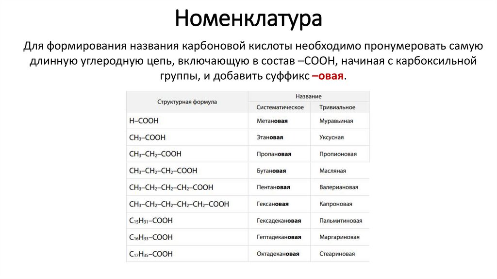 Для формирования названия карбоновой кислоты необходимо пронумеровать самуюдлинную углеродную цепь, включающую в состав –СООН, начиная с карбоксильной