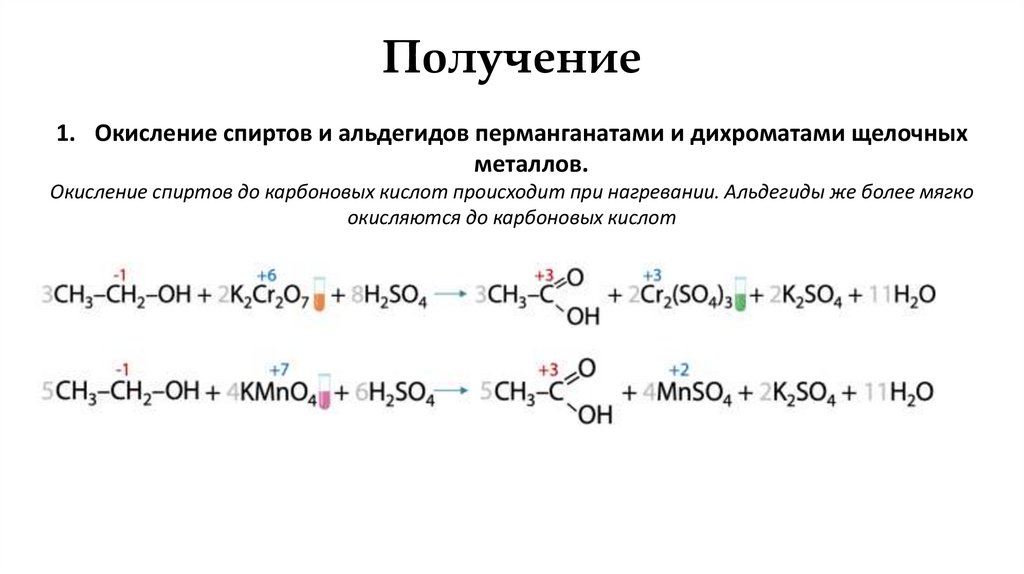 1. Окисление спиртов и альдегидов перманганатами и дихроматами щелочныхметаллов.