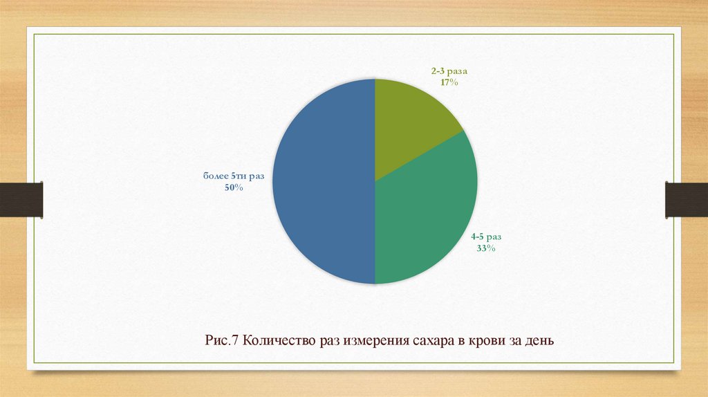 5. По измерению сахара в крови мы узнали, что 50% измеряют уровень сахара в крови более 5ти раз в день, 33% измеряют 4-5 раз и 17%