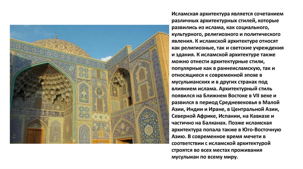 Исламская архитектура является сочетаниемразличных архитектурных стилей, которые