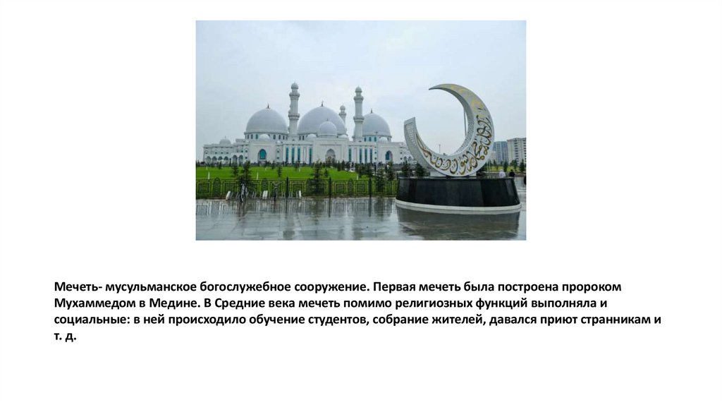 Мечеть- мусульманское богослужебное сооружение. Первая мечеть была построена пророкомМухаммедом в Медине. В Средние века мечеть помимо религиозных функций выполняла и