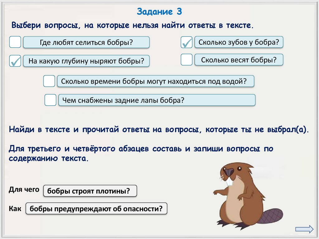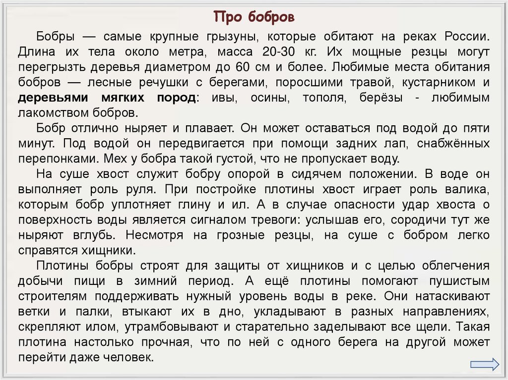 Даша сказала: «В тексте говорится о том, как бобры плавают и ныряют».