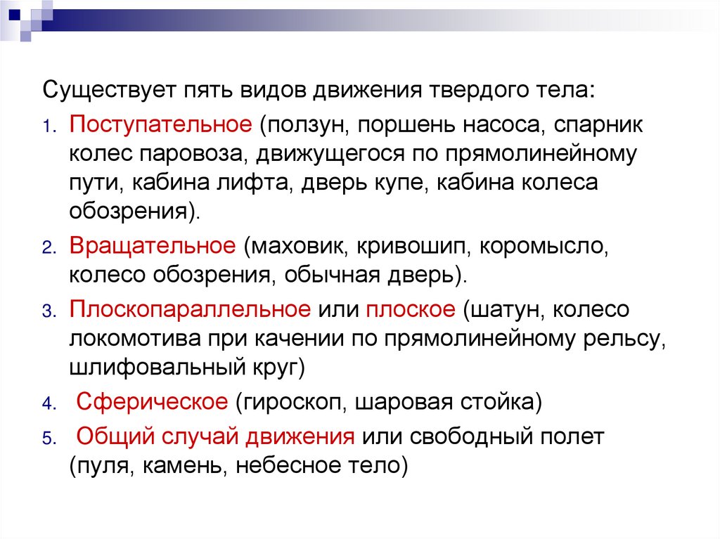 Существует пять видов движения твердого тела:1. Поступательное (ползун, поршень насоса, спарник