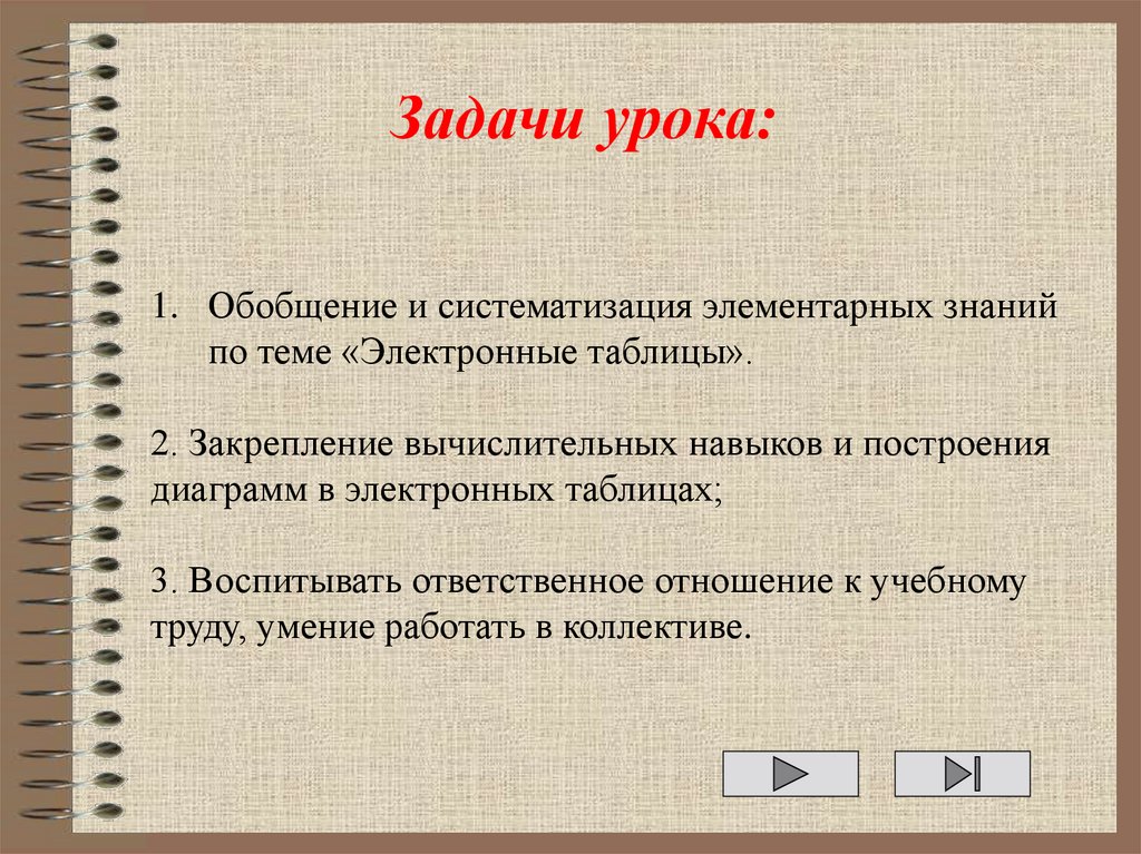 2. 1.Обобщить элементарные знания учащихся по теме “Электронные таблицы”; 2. Продолжить работу по формированию навыков