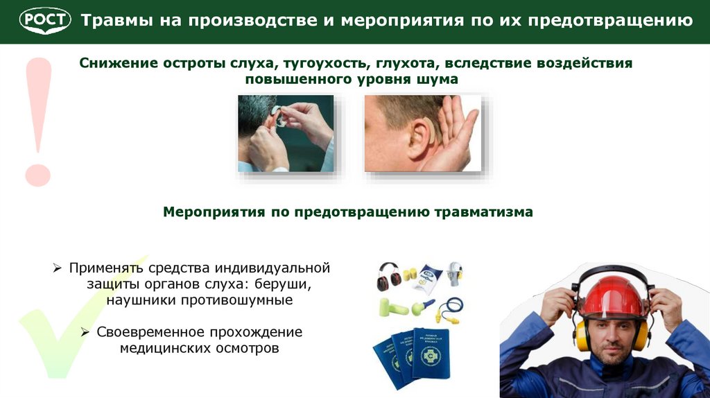 Травмы на производстве и мероприятия по их предотвращениюСнижение остроты слуха, тугоухость, глухота, вследствие воздействия