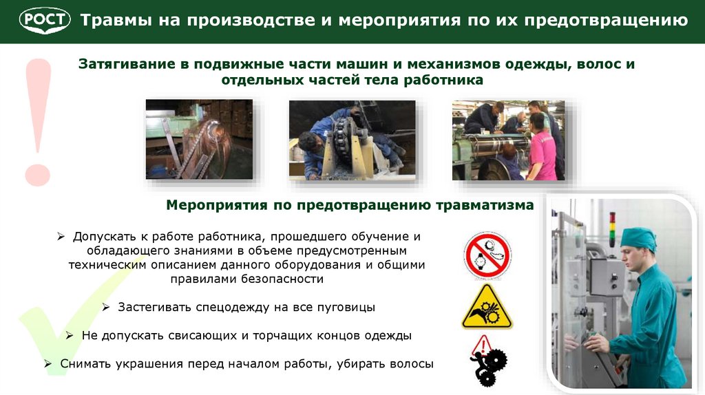 Травмы на производстве и мероприятия по их предотвращениюЗатягивание в подвижные части машин и механизмов одежды, волос и