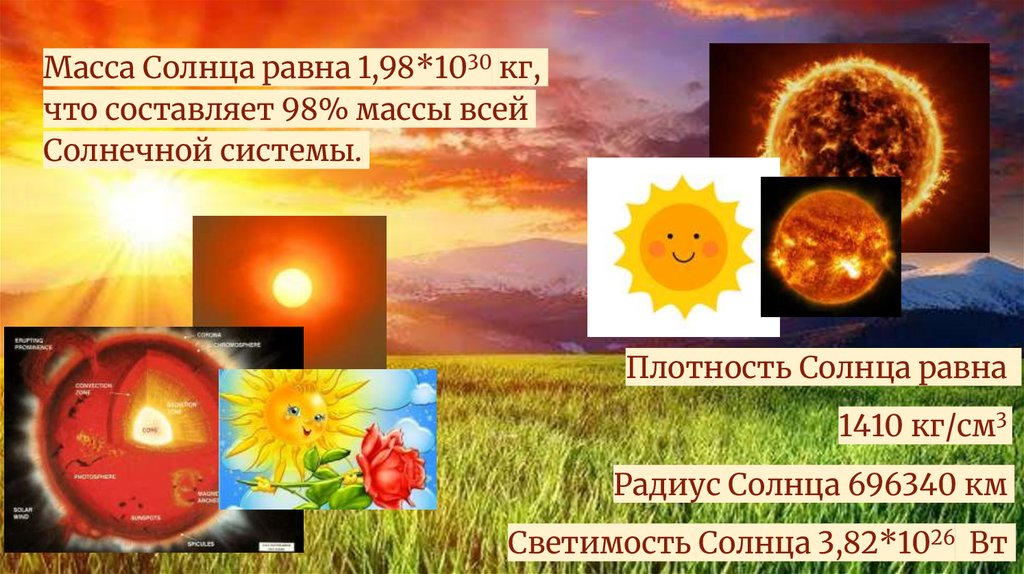 Масса Солнца равна 1,98*1030 кг,что составляет 98% массы всей