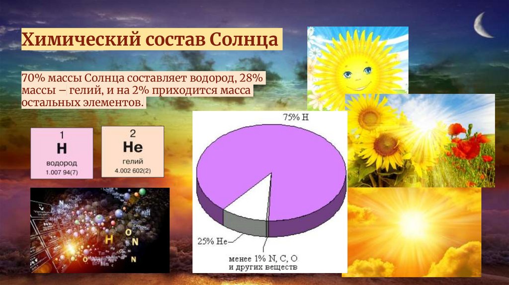 Химический состав Солнца70% массы Солнца составляет водород, 28%