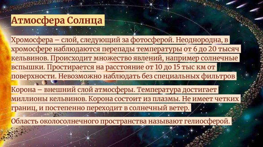 Атмосфера СолнцаХромосфера – слой, следующий за фотосферой. Неоднородна, в