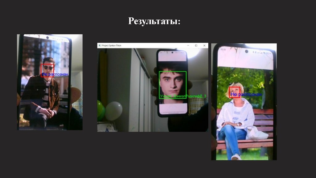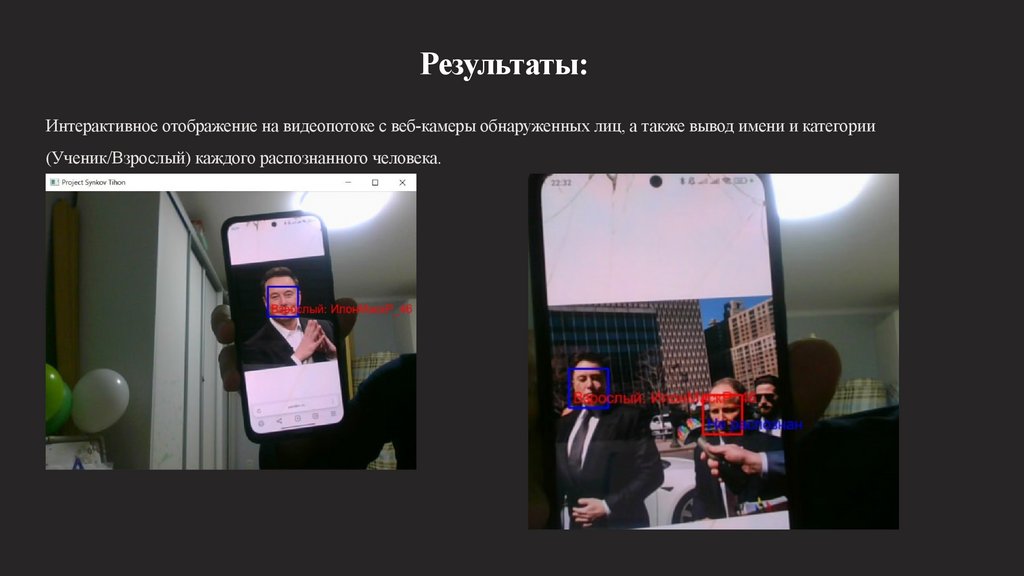 Результаты:Интерактивное отображение на видеопотоке с веб-камеры обнаруженных лиц, а также вывод имени и категории