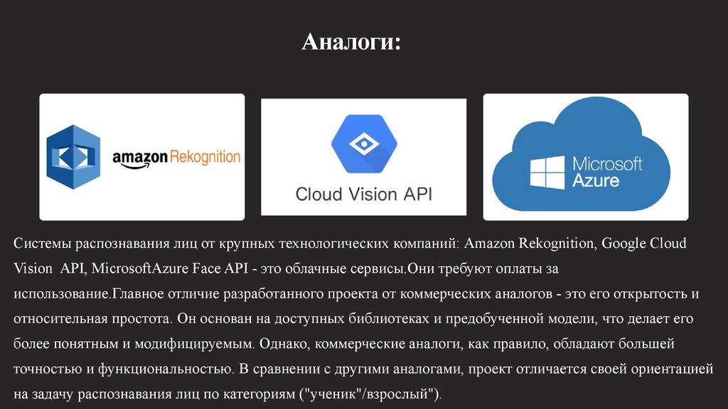 Аналоги:Системы распознавания лиц от крупных технологических компаний: Amazon Rekognition, Google Cloud