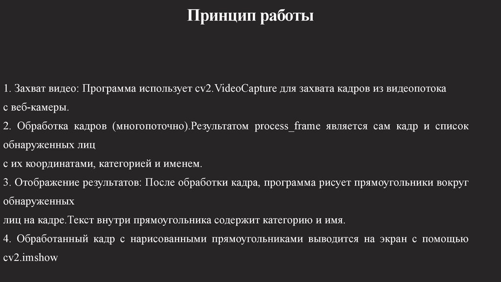 Принцип работы1. Захват видео: Программа использует cv2.VideoCapture для захвата кадров из видеопотока