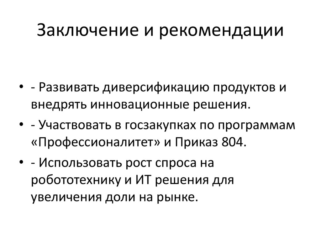 Заключение и рекомендации• - Развивать диверсификацию продуктов и