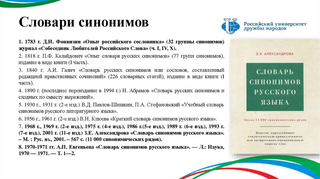 1. 1783 г. Д.И. Фонвизин «Опыт российского сословника» (32 группы синонимов)журнал «Собеседник Любителей Российского Слова» (ч. I, IV, X).