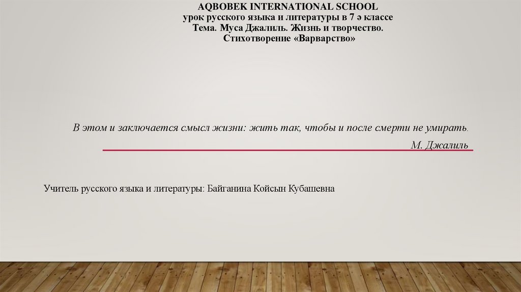 1. Aqbobek International School урок русского языка и литературы в 7 ә классе Тема. Муса Джалиль. Жизнь и творчество.